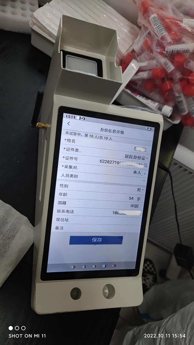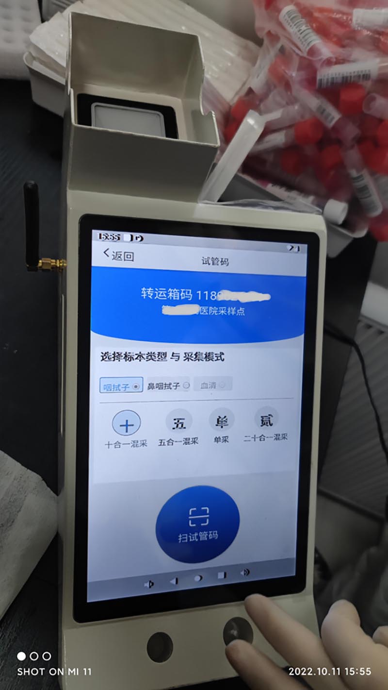 核酸碼采集終端一體機一般放置在采樣操作的桌面上,也可以固定在采樣窗臺上。進行采樣時醫療人員應先根據采樣任務(單人單管、五人一管、十人一管、十五人一管或二十人一管)的要求在核酸碼采集終端一體機上進行相對應的選擇,然后對試管條碼進行掃描;接著受檢人員上前向核酸碼采集終端一體機出示核酸采樣碼或身份證,核酸碼采集終端一體機可在一秒內完成信息的讀取與上傳;最后由醫療人員為受檢人員進行鼻拭子或咽拭子,在完成既定人數采樣后,核酸碼采集終端一體機會自動結束這管試劑的數據錄入并實時上傳平臺系統。此時,醫療采樣人員只需要拿出新的試管掃碼即可開啟新管進行下一輪采樣。