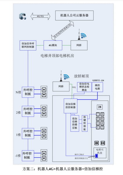 機器人通過無線信號的傳輸,將乘梯指令直接下達到電梯控制系統,電梯狀態監測實時識別樓層,實現機器人自主乘梯,直達目的樓層。該方案解決了機器人改變了以往只能在平層移動的限制,大大拓展機器人的應用范圍和領域。