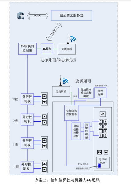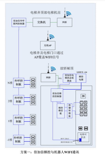 應“人工智能”服務機器人的發展趨勢,在垂直電梯管理方面,也陸續推出了一系列針對機器人乘梯通行的解決方案。倍-加-信-科-技采用先進的物聯網和云計算技術,通過WIFI、4G等無線方式實現對接,實現機器人自主乘梯。