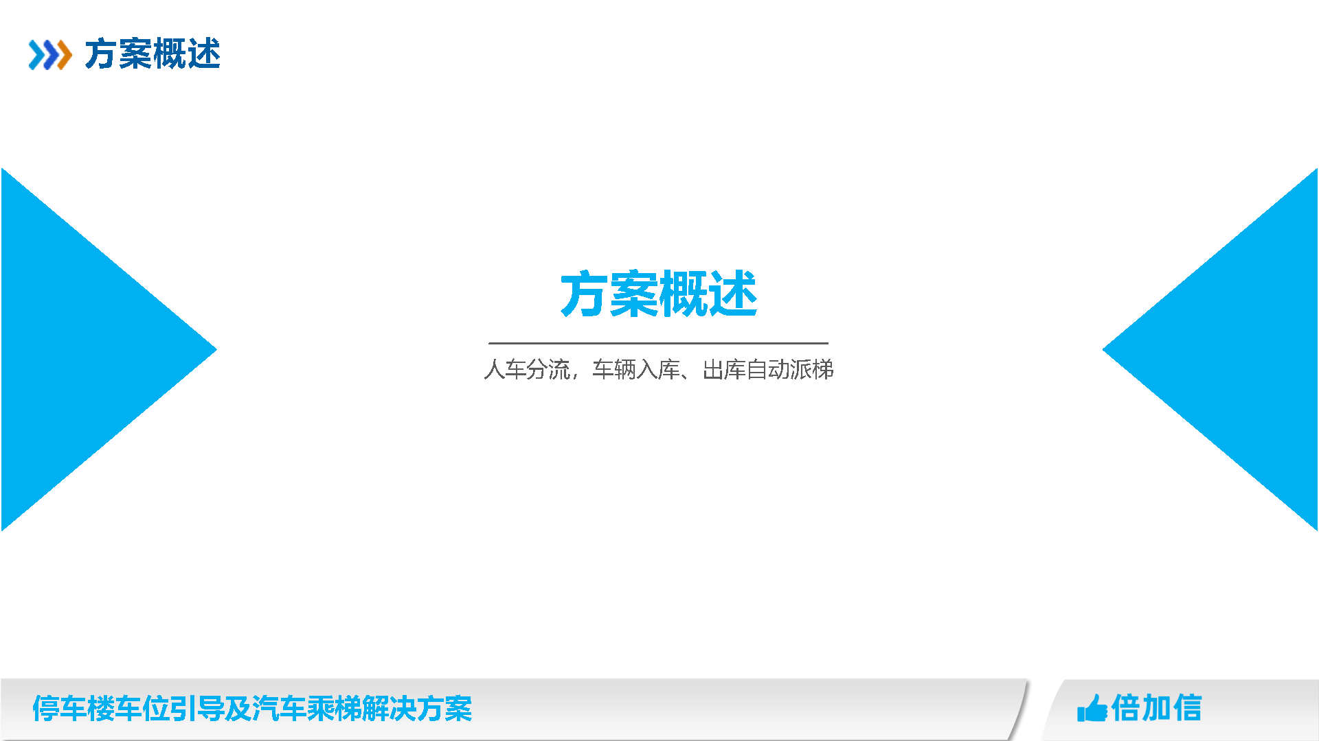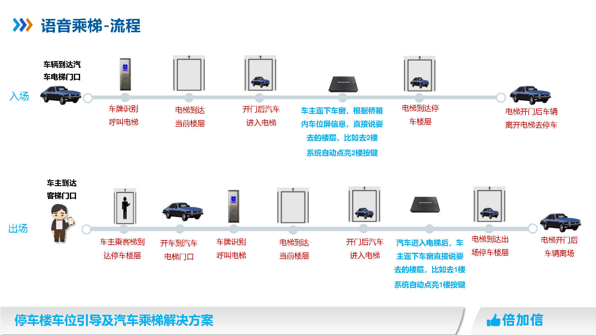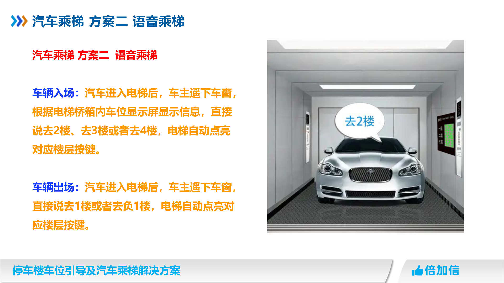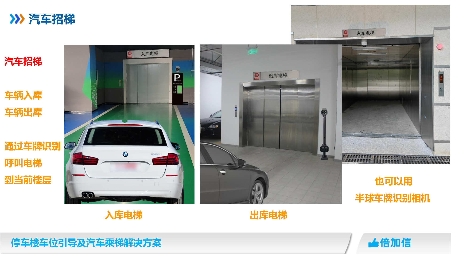 倍加信汽車乘梯系統方案優勢 1、通過視頻/超聲波/地磁,實時獲取停車樓各樓層空余車位數/ 2、入庫電梯屏、電梯橋箱屏、分區引導屏實時引導車主停車 3、車牌識別自動呼叫電梯到達當前樓層,包括入場乘梯和離場乘梯 4、不需要電梯提供協議,汽車派梯系統可自動根據各樓層空余車位數,自動派梯 5、不需要電梯提供協議,可實時獲取電梯當前停靠樓層、電梯上下行狀態、開關門狀態 6、不需要電梯提供協議,可語音識別招梯和乘梯,包括客梯也可以語音乘梯 7、不需要電梯提供協議,可實現汽車電梯禁止人員乘梯,包括內呼和外呼都禁止 8、可自動派梯和語音乘梯組合使用,特別是離場樓層有多層情況車主可自己選擇樓層 9、汽車乘梯過程可禁止其他汽車招梯,防止電梯未到達指定樓層就停靠 10、可在電梯門口增加紅綠指示燈,顯示當前汽車電梯是可用或正在使用狀態 11、電梯提供協議,也可以與電梯協議對接實現上面所有功能