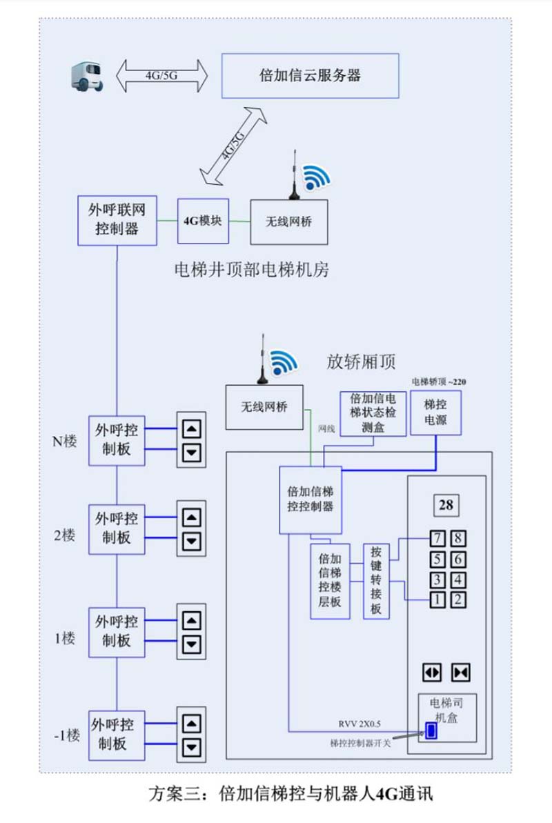 (1)機器人進入電梯后,通個Wifi或4G網絡發送指令給倍加信梯控云平臺,倍加信梯控云平臺收到指令后,將指令發給倍加信梯控系統,倍加信梯控系統自動點亮對應樓層按鍵,比如發去6樓指令,則6樓按鍵自動點亮,電梯送機器人員到6樓。