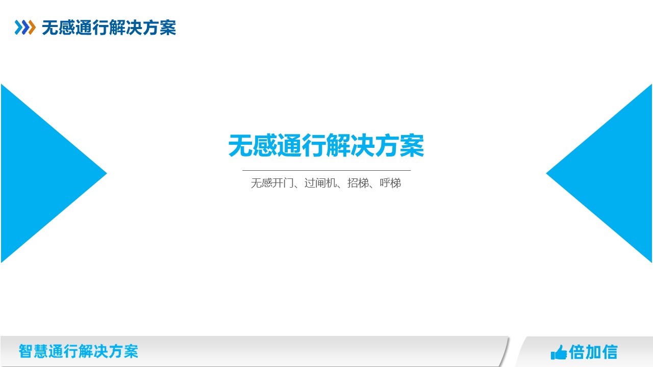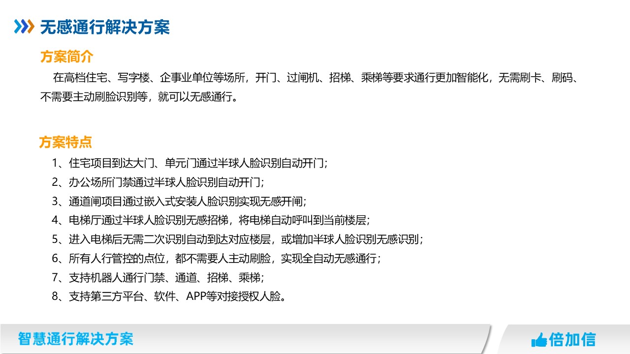 在高檔住宅、寫字樓、企事業(yè)單位等場(chǎng)所,開門、過閘機(jī)、招梯、乘梯等要求通行更加智能化,無(wú)需刷卡、刷碼、不需要主動(dòng)刷臉識(shí)別等,就可以無(wú)感通行。