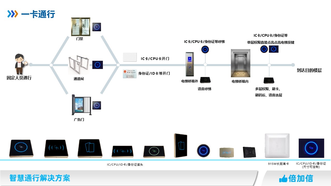 在住宅、寫字樓、酒店、醫院、學校等場景,實現一次授權發卡,可以通行所有門禁、閘機、電梯等設備。設備可脫機、可聯網,施工維保簡單。