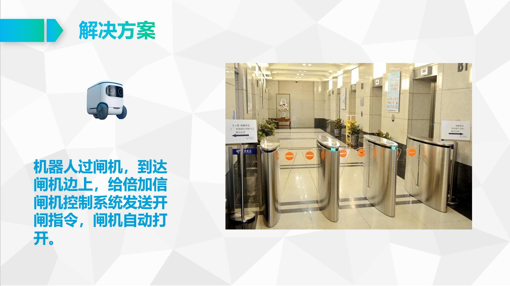機(jī)器人過(guò)閘機(jī),到達(dá)閘機(jī)邊上,給倍加信閘機(jī)控制系統(tǒng)發(fā)送開(kāi)閘指令,閘機(jī)自動(dòng)打開(kāi)。