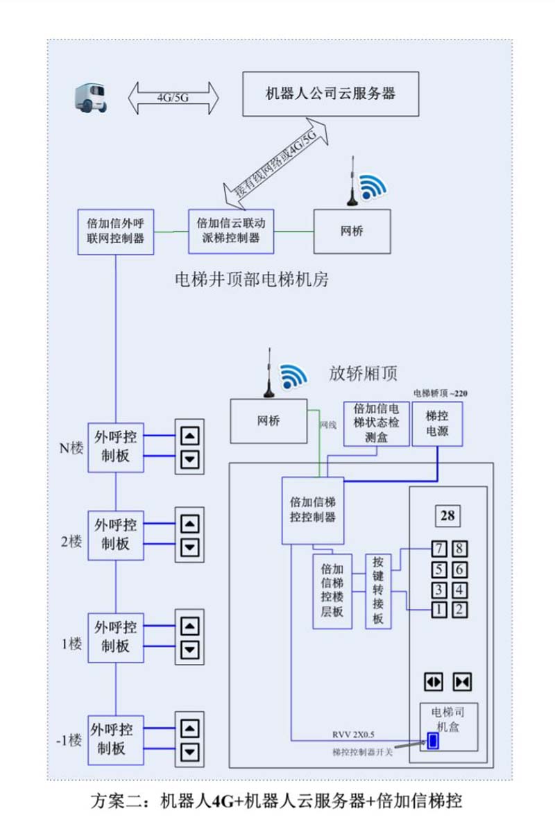(1)機器人在電梯外,通過4G網(wǎng)絡等發(fā)送指令機器人云服務器,機器人云服務器再與倍加信梯控系統(tǒng)通訊,系統(tǒng)自動點亮上樓或下樓按鍵,實現(xiàn)呼梯功能。