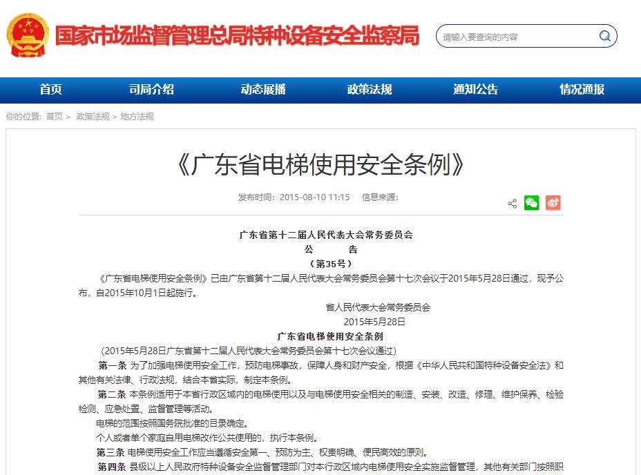 《廣東省電梯使用安全條例》廣東省第十二屆人民代表大會常務委員會(2015年第35號)