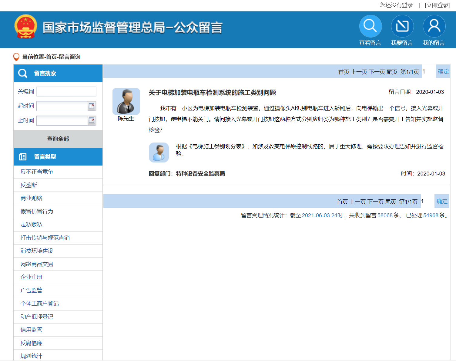 • 我市有一小區為電梯加裝電瓶車檢測裝置,通過攝像頭AI識別電瓶車進入轎廂后,向電梯輸出一個信號,接入光幕或開門按鈕,使電梯不能關門。請問接入光幕或開門按鈕這兩種方式分別應歸類為哪種施工類別?是否需要開工告知并實施監督檢驗?